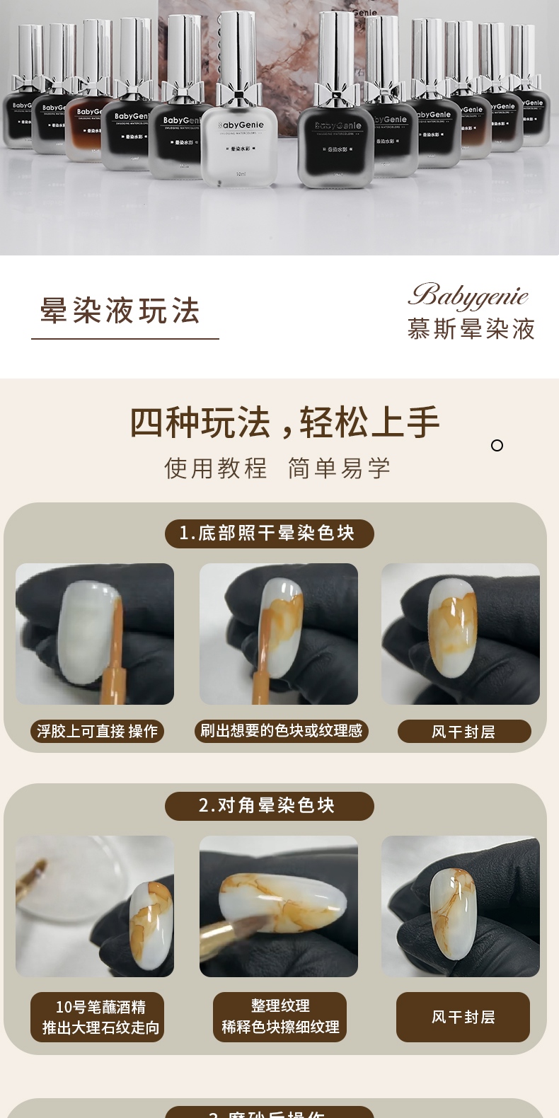 色膠後可直接刷上暈染液,或者是色膠後使用磨砂封層,再使用暈染液。暈染液無需照燈。